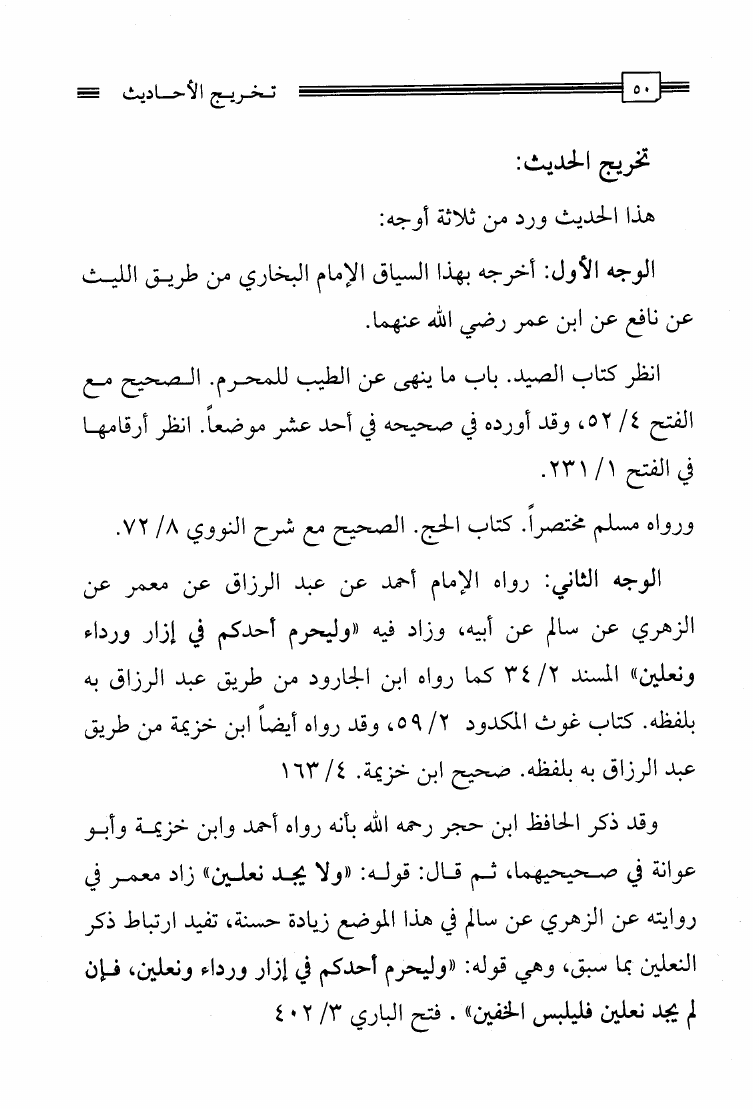 نام کتاب : مشكل لباس الإحرام دراسة ست مسائل من أحكام لباس الإحرام مع تخريج الأحاديث والتعريف بأسماء الألبسة نویسنده : إبراهيم بن محمد الصبيحي جلد : 1 صفحه : 50