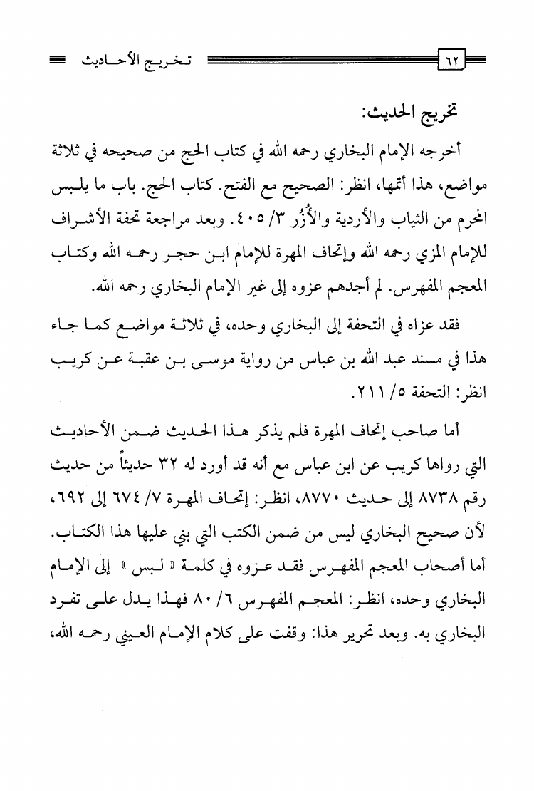 نام کتاب : مشكل لباس الإحرام دراسة ست مسائل من أحكام لباس الإحرام مع تخريج الأحاديث والتعريف بأسماء الألبسة نویسنده : إبراهيم بن محمد الصبيحي جلد : 1 صفحه : 62