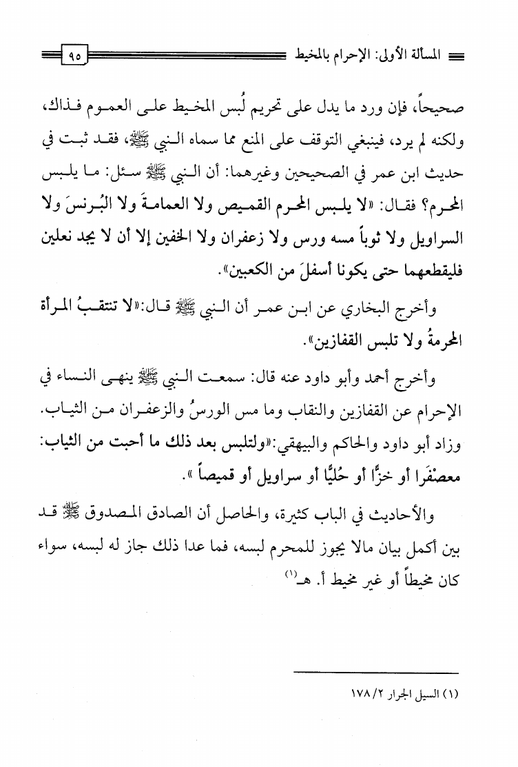 نام کتاب : مشكل لباس الإحرام دراسة ست مسائل من أحكام لباس الإحرام مع تخريج الأحاديث والتعريف بأسماء الألبسة نویسنده : إبراهيم بن محمد الصبيحي جلد : 1 صفحه : 95