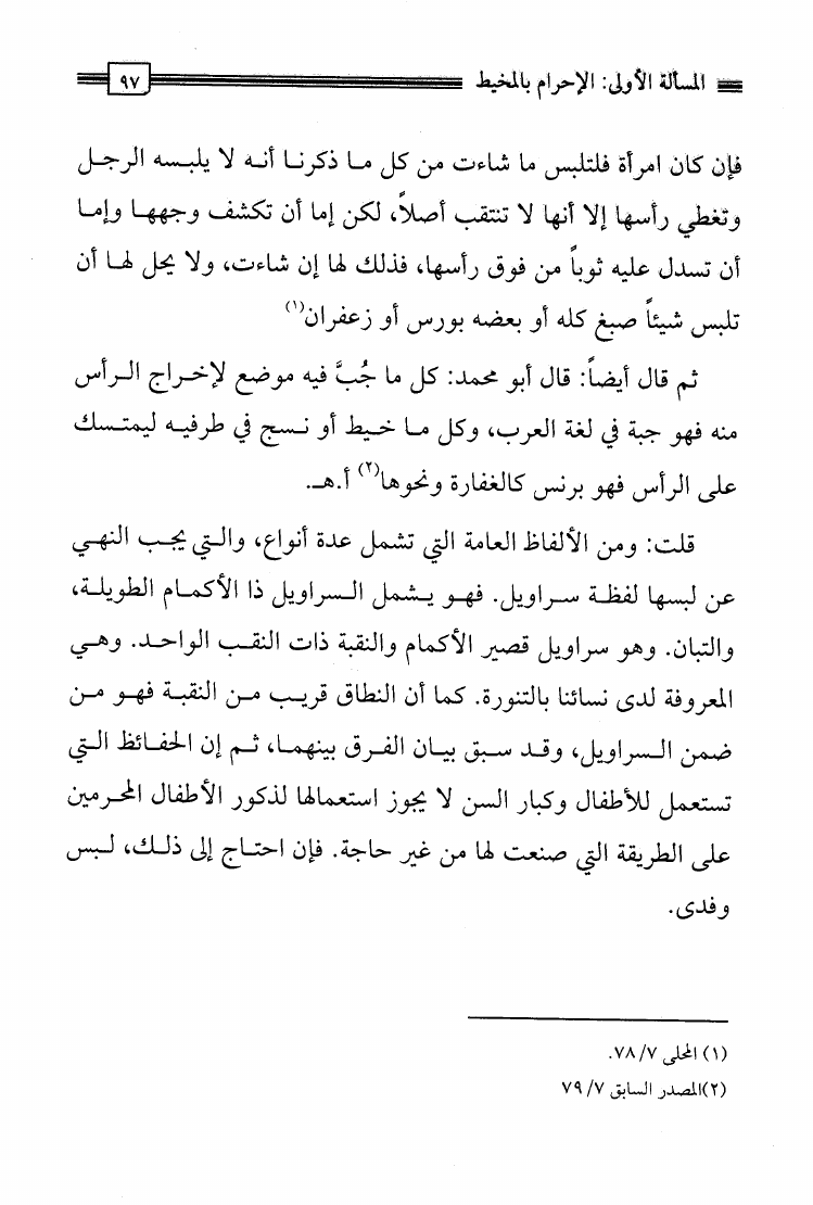 نام کتاب : مشكل لباس الإحرام دراسة ست مسائل من أحكام لباس الإحرام مع تخريج الأحاديث والتعريف بأسماء الألبسة نویسنده : إبراهيم بن محمد الصبيحي جلد : 1 صفحه : 97