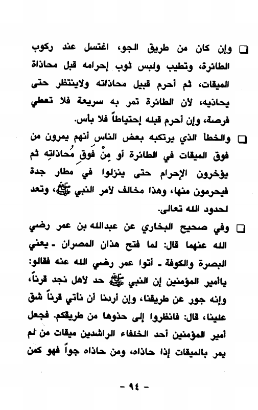 نام کتاب : مناسك الحج والعمرة والمشروع في الزيارة والأخطاء القولية والفعلية من الإحرام حتى الزيارة وأسئلة مهمة نویسنده : محمد بن صالح العثيمين جلد : 1 صفحه : 94