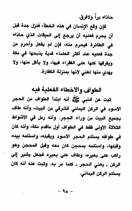 نام کتاب : مناسك الحج والعمرة والمشروع في الزيارة والأخطاء القولية والفعلية من الإحرام حتى الزيارة وأسئلة مهمة نویسنده : محمد بن صالح العثيمين جلد : 1 صفحه : 95
