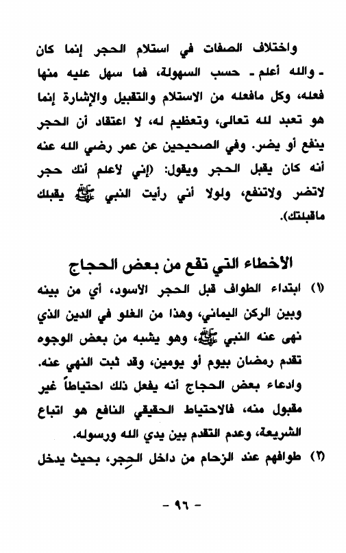 نام کتاب : مناسك الحج والعمرة والمشروع في الزيارة والأخطاء القولية والفعلية من الإحرام حتى الزيارة وأسئلة مهمة نویسنده : محمد بن صالح العثيمين جلد : 1 صفحه : 96
