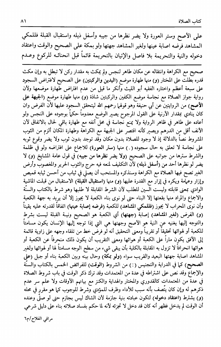 نام کتاب : مراقي الفلاح بإمداد الفتاح شرح نور الإيضاح ونجاة الأرواح وبهامشه متن نور الإيضاح مع تقريرات من حاشية الطحطاوي نویسنده : حسن بن عمار بن علي الشرنبلالي الحنفي جلد : 1 صفحه : 81