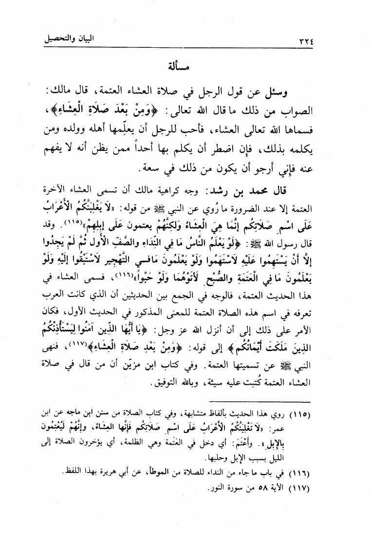 نام کتاب : البيان والتحصيل والشرح والتوجيه والتعليل في المسائل المستخرجة، وضمنه: المستخرجة من الأسمعة المعروفة بالعتبية نویسنده : محمد بن أحمد بن رشد القرطبي أبو الوليد جلد : 1 صفحه : 324
