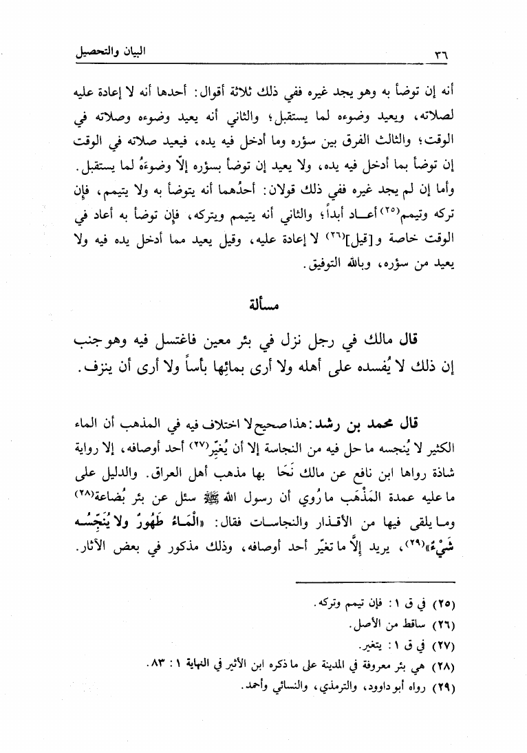 نام کتاب : البيان والتحصيل والشرح والتوجيه والتعليل في المسائل المستخرجة، وضمنه: المستخرجة من الأسمعة المعروفة بالعتبية نویسنده : محمد بن أحمد بن رشد القرطبي أبو الوليد جلد : 1 صفحه : 36