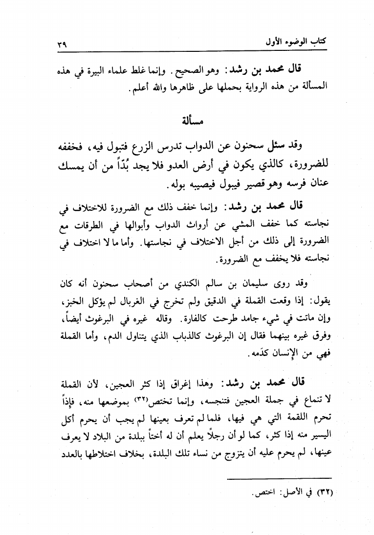 نام کتاب : البيان والتحصيل والشرح والتوجيه والتعليل في المسائل المستخرجة، وضمنه: المستخرجة من الأسمعة المعروفة بالعتبية نویسنده : محمد بن أحمد بن رشد القرطبي أبو الوليد جلد : 1 صفحه : 39