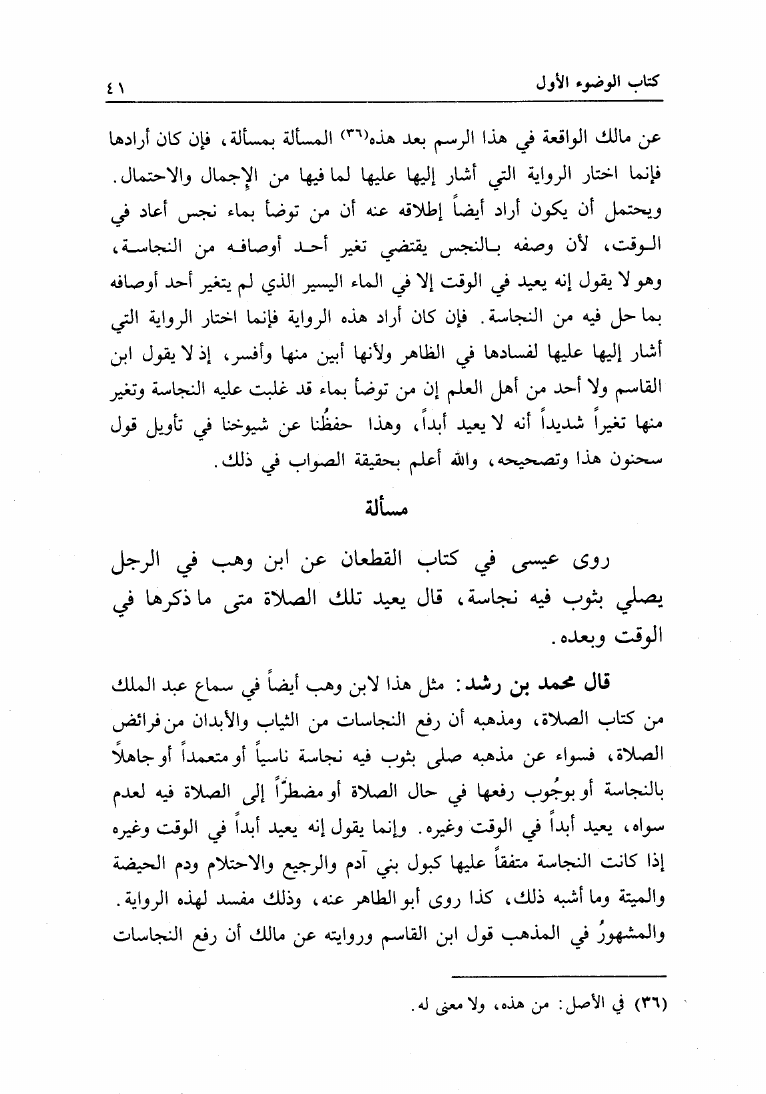 نام کتاب : البيان والتحصيل والشرح والتوجيه والتعليل في المسائل المستخرجة، وضمنه: المستخرجة من الأسمعة المعروفة بالعتبية نویسنده : محمد بن أحمد بن رشد القرطبي أبو الوليد جلد : 1 صفحه : 41