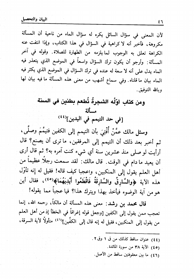 نام کتاب : البيان والتحصيل والشرح والتوجيه والتعليل في المسائل المستخرجة، وضمنه: المستخرجة من الأسمعة المعروفة بالعتبية نویسنده : محمد بن أحمد بن رشد القرطبي أبو الوليد جلد : 1 صفحه : 46