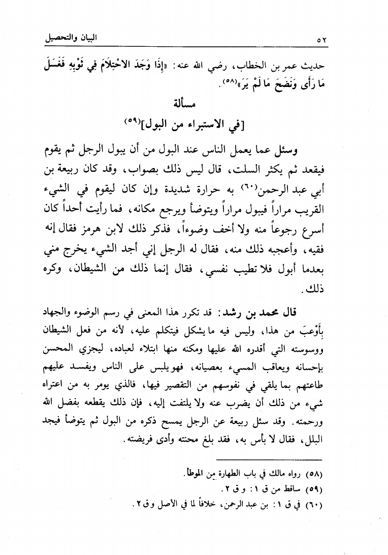 نام کتاب : البيان والتحصيل والشرح والتوجيه والتعليل في المسائل المستخرجة، وضمنه: المستخرجة من الأسمعة المعروفة بالعتبية نویسنده : محمد بن أحمد بن رشد القرطبي أبو الوليد جلد : 1 صفحه : 52