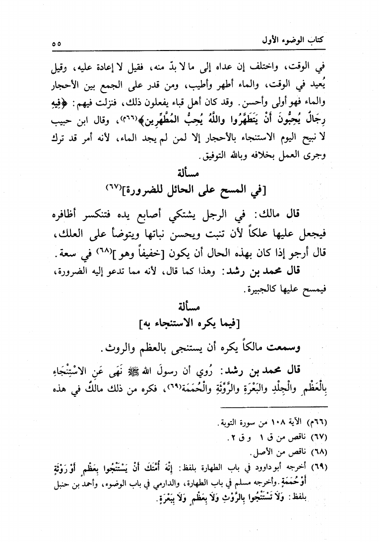 نام کتاب : البيان والتحصيل والشرح والتوجيه والتعليل في المسائل المستخرجة، وضمنه: المستخرجة من الأسمعة المعروفة بالعتبية نویسنده : محمد بن أحمد بن رشد القرطبي أبو الوليد جلد : 1 صفحه : 55