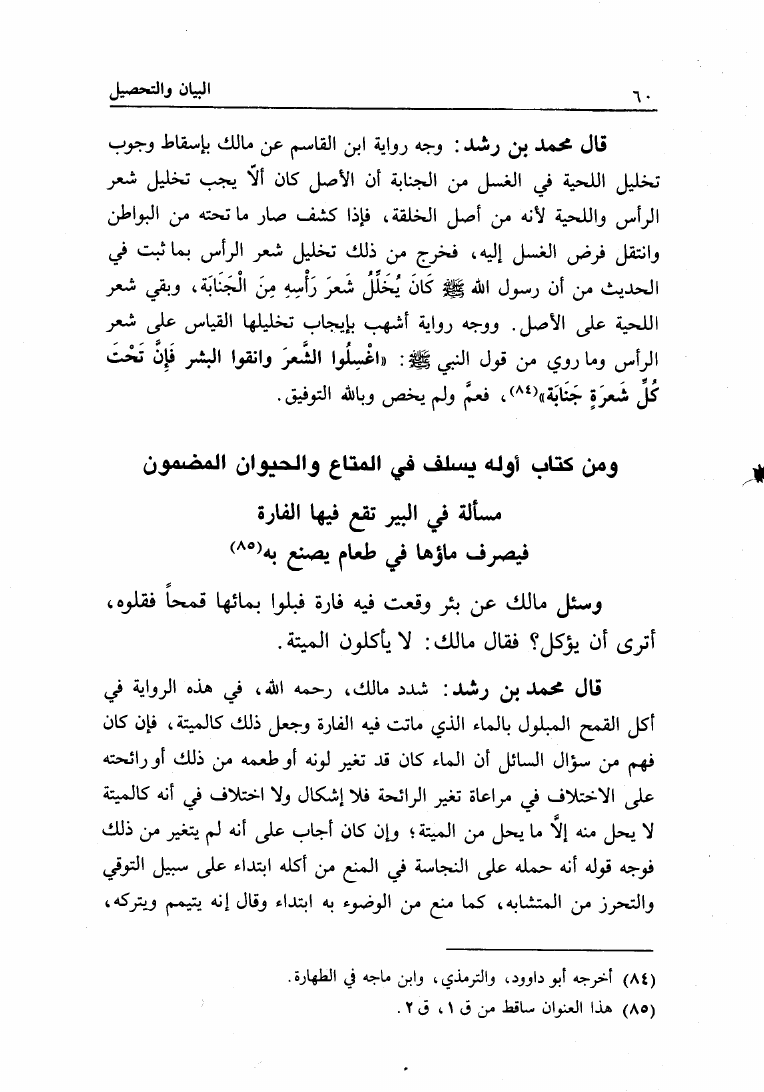 نام کتاب : البيان والتحصيل والشرح والتوجيه والتعليل في المسائل المستخرجة، وضمنه: المستخرجة من الأسمعة المعروفة بالعتبية نویسنده : محمد بن أحمد بن رشد القرطبي أبو الوليد جلد : 1 صفحه : 60