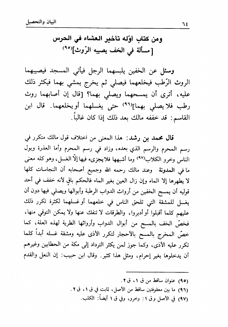 نام کتاب : البيان والتحصيل والشرح والتوجيه والتعليل في المسائل المستخرجة، وضمنه: المستخرجة من الأسمعة المعروفة بالعتبية نویسنده : محمد بن أحمد بن رشد القرطبي أبو الوليد جلد : 1 صفحه : 64
