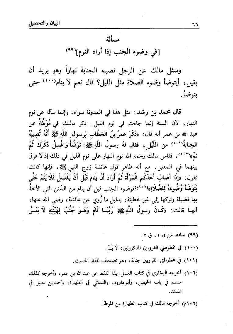 نام کتاب : البيان والتحصيل والشرح والتوجيه والتعليل في المسائل المستخرجة، وضمنه: المستخرجة من الأسمعة المعروفة بالعتبية نویسنده : محمد بن أحمد بن رشد القرطبي أبو الوليد جلد : 1 صفحه : 66