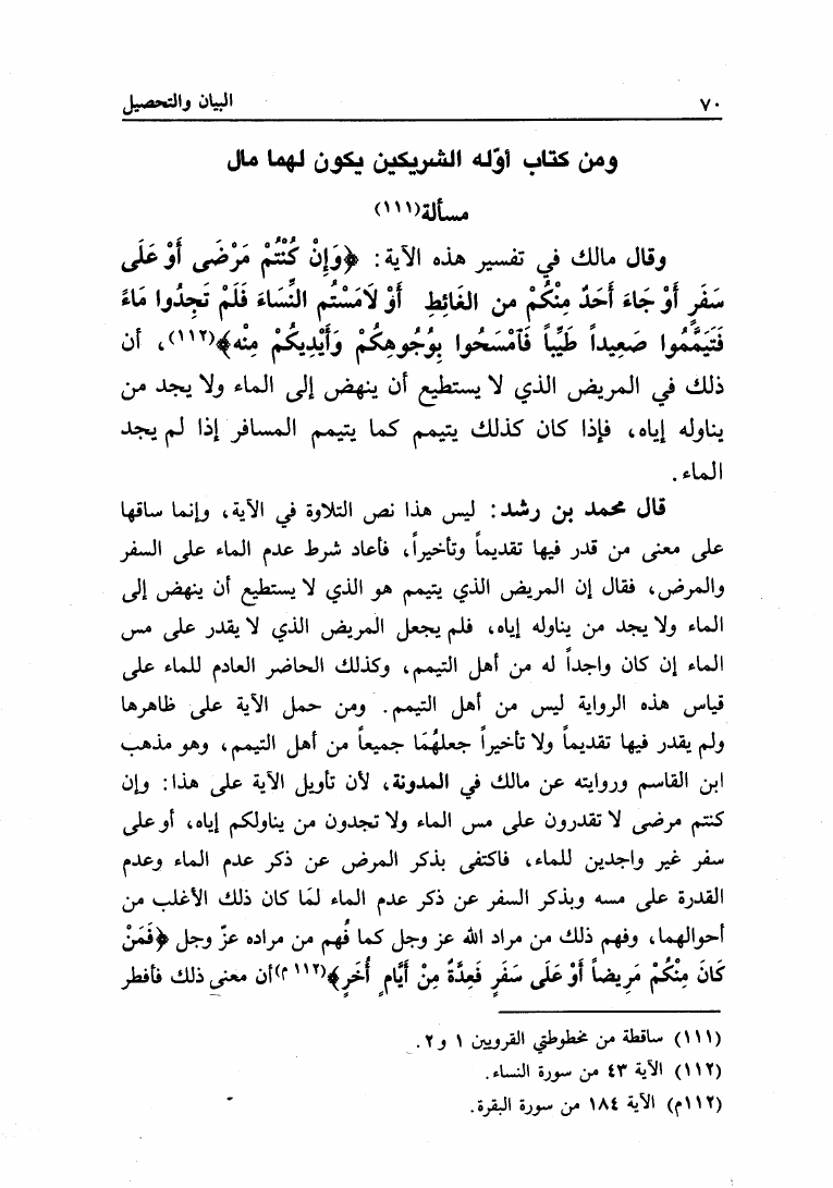 نام کتاب : البيان والتحصيل والشرح والتوجيه والتعليل في المسائل المستخرجة، وضمنه: المستخرجة من الأسمعة المعروفة بالعتبية نویسنده : محمد بن أحمد بن رشد القرطبي أبو الوليد جلد : 1 صفحه : 70