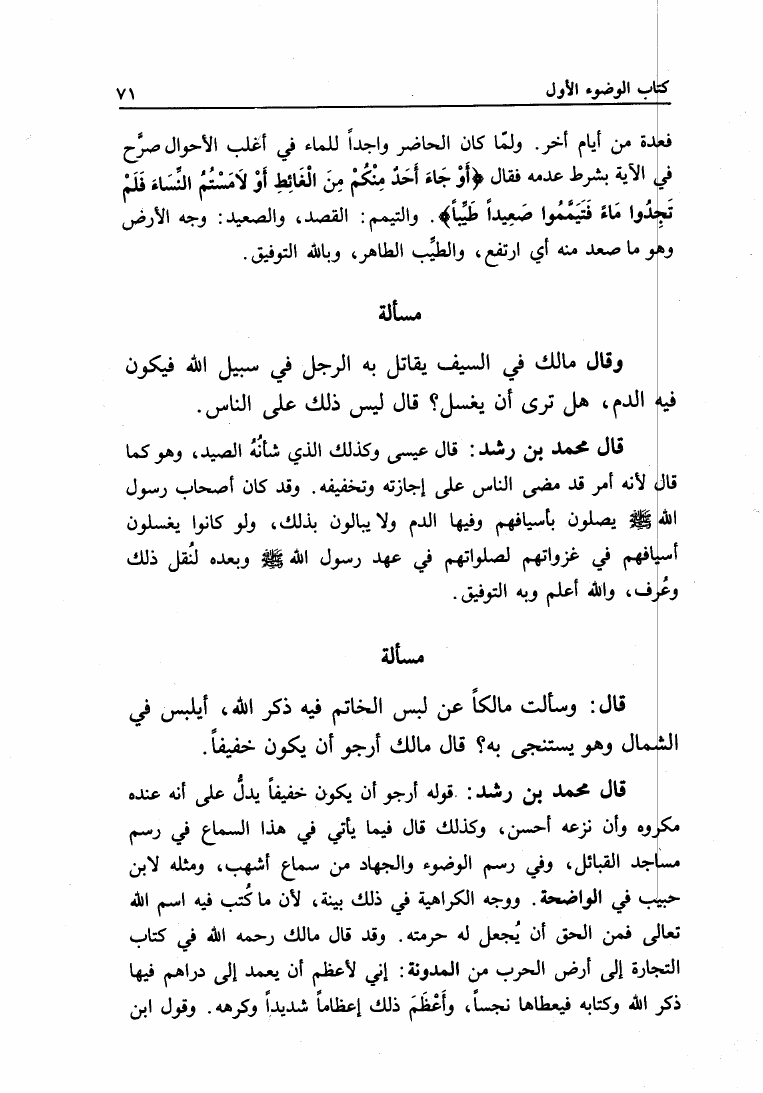 نام کتاب : البيان والتحصيل والشرح والتوجيه والتعليل في المسائل المستخرجة، وضمنه: المستخرجة من الأسمعة المعروفة بالعتبية نویسنده : محمد بن أحمد بن رشد القرطبي أبو الوليد جلد : 1 صفحه : 71