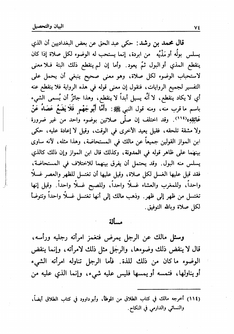 نام کتاب : البيان والتحصيل والشرح والتوجيه والتعليل في المسائل المستخرجة، وضمنه: المستخرجة من الأسمعة المعروفة بالعتبية نویسنده : محمد بن أحمد بن رشد القرطبي أبو الوليد جلد : 1 صفحه : 74