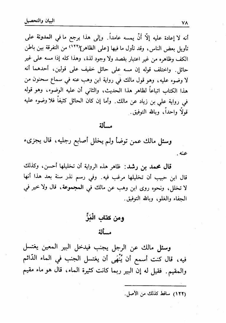 نام کتاب : البيان والتحصيل والشرح والتوجيه والتعليل في المسائل المستخرجة، وضمنه: المستخرجة من الأسمعة المعروفة بالعتبية نویسنده : محمد بن أحمد بن رشد القرطبي أبو الوليد جلد : 1 صفحه : 78
