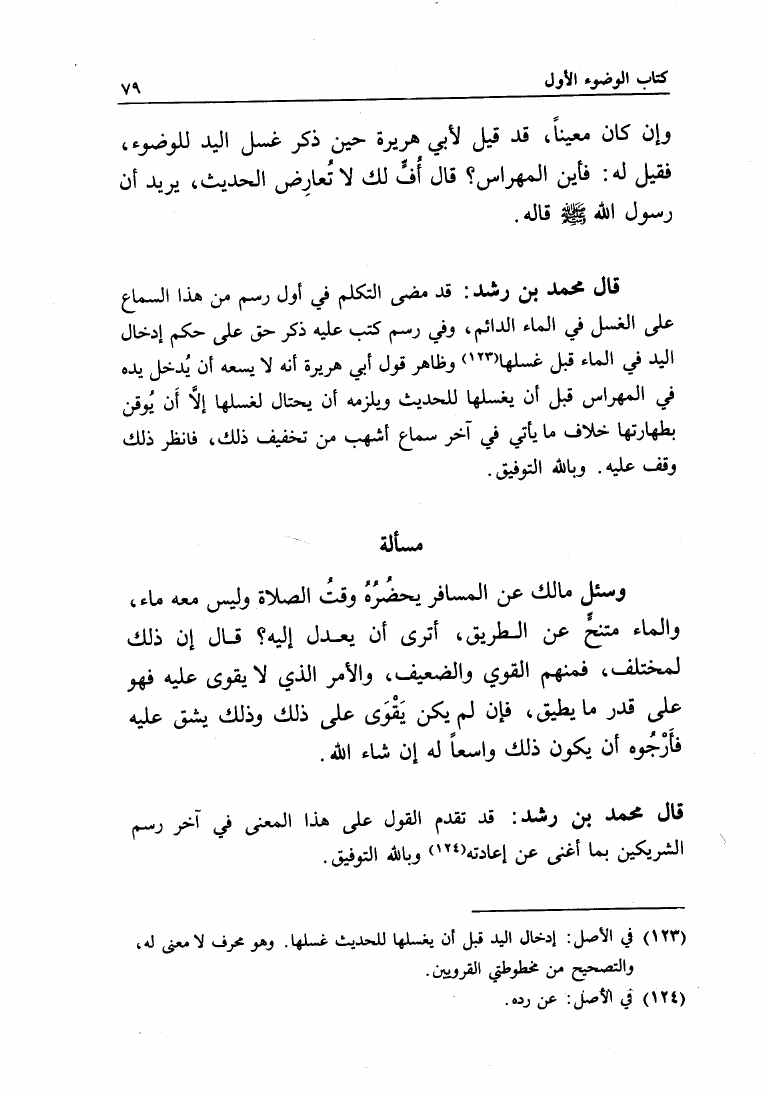 نام کتاب : البيان والتحصيل والشرح والتوجيه والتعليل في المسائل المستخرجة، وضمنه: المستخرجة من الأسمعة المعروفة بالعتبية نویسنده : محمد بن أحمد بن رشد القرطبي أبو الوليد جلد : 1 صفحه : 79