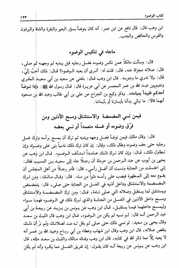 نام کتاب : المدونة الكبرى للإمام مالك رواية سحنون - ويليها مقدمات ابن رشد - ومعه: كتاب تزيين الممالك بمناقب سيدنا الإمام مالك للسيوطي، وكتاب مناقب سيدنا الإمام مالك للزواوي نویسنده : مالك بن أنس جلد : 1 صفحه : 123