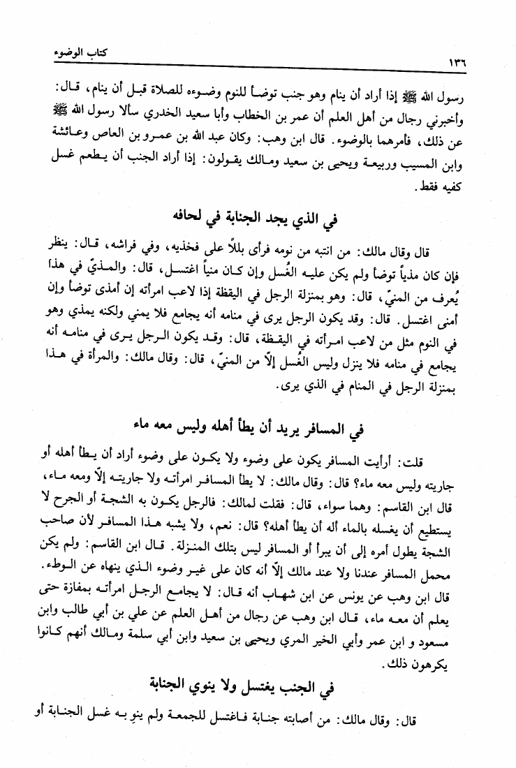 نام کتاب : المدونة الكبرى للإمام مالك رواية سحنون - ويليها مقدمات ابن رشد - ومعه: كتاب تزيين الممالك بمناقب سيدنا الإمام مالك للسيوطي، وكتاب مناقب سيدنا الإمام مالك للزواوي نویسنده : مالك بن أنس جلد : 1 صفحه : 136