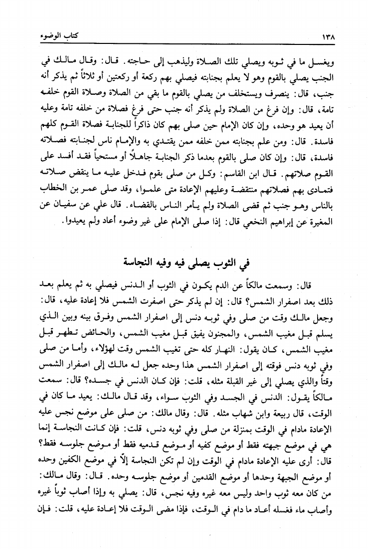 نام کتاب : المدونة الكبرى للإمام مالك رواية سحنون - ويليها مقدمات ابن رشد - ومعه: كتاب تزيين الممالك بمناقب سيدنا الإمام مالك للسيوطي، وكتاب مناقب سيدنا الإمام مالك للزواوي نویسنده : مالك بن أنس جلد : 1 صفحه : 138