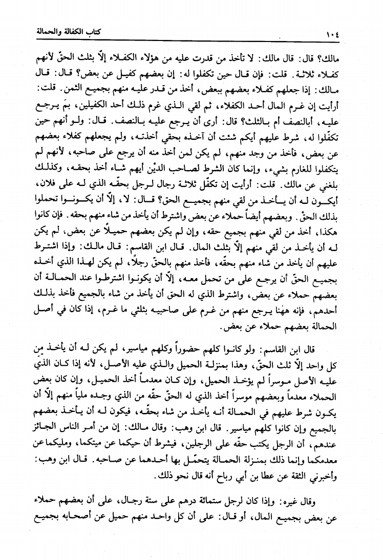 نام کتاب : المدونة الكبرى للإمام مالك رواية سحنون - ويليها مقدمات ابن رشد - ومعه: كتاب تزيين الممالك بمناقب سيدنا الإمام مالك للسيوطي، وكتاب مناقب سيدنا الإمام مالك للزواوي نویسنده : مالك بن أنس جلد : 4 صفحه : 104