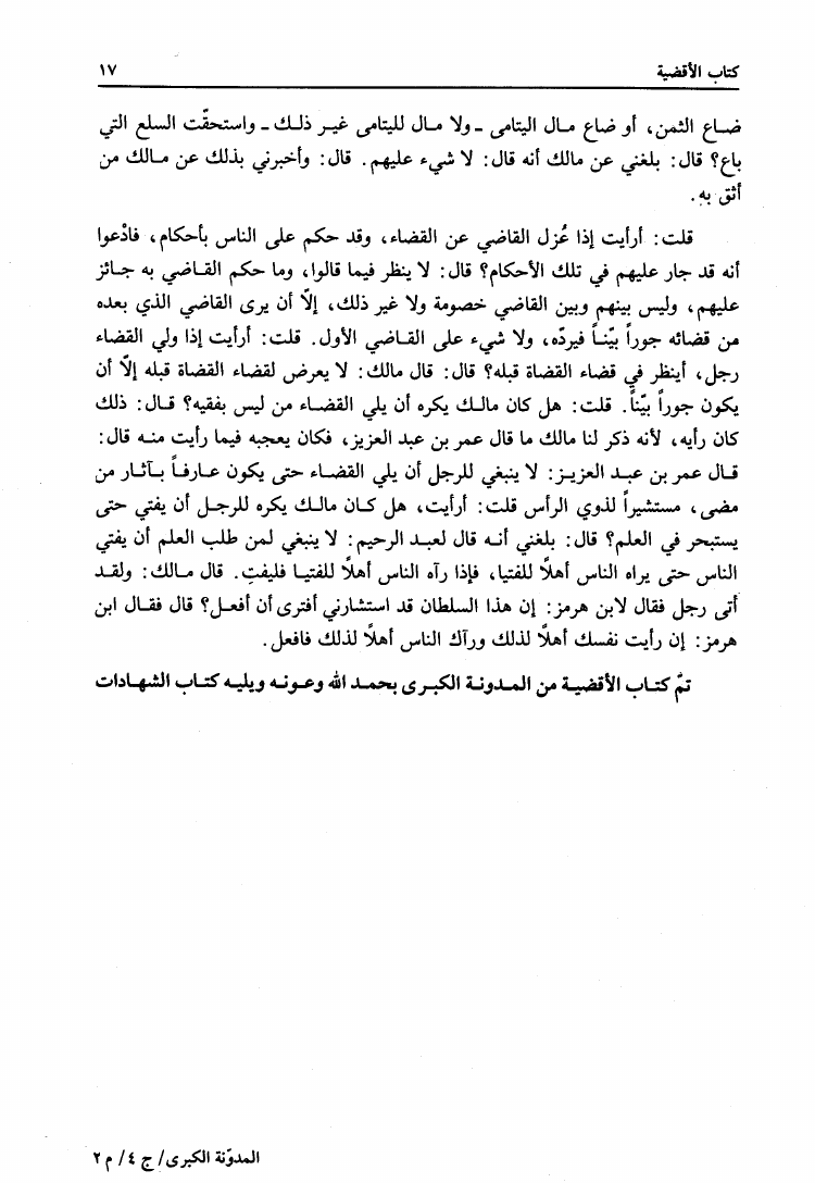 نام کتاب : المدونة الكبرى للإمام مالك رواية سحنون - ويليها مقدمات ابن رشد - ومعه: كتاب تزيين الممالك بمناقب سيدنا الإمام مالك للسيوطي، وكتاب مناقب سيدنا الإمام مالك للزواوي نویسنده : مالك بن أنس جلد : 4 صفحه : 17