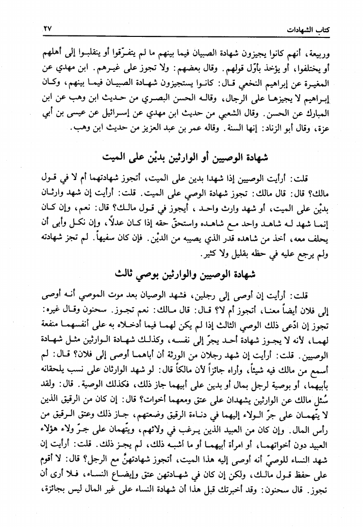 نام کتاب : المدونة الكبرى للإمام مالك رواية سحنون - ويليها مقدمات ابن رشد - ومعه: كتاب تزيين الممالك بمناقب سيدنا الإمام مالك للسيوطي، وكتاب مناقب سيدنا الإمام مالك للزواوي نویسنده : مالك بن أنس جلد : 4 صفحه : 27