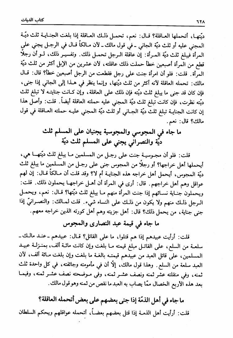 نام کتاب : المدونة الكبرى للإمام مالك رواية سحنون - ويليها مقدمات ابن رشد - ومعه: كتاب تزيين الممالك بمناقب سيدنا الإمام مالك للسيوطي، وكتاب مناقب سيدنا الإمام مالك للزواوي نویسنده : مالك بن أنس جلد : 4 صفحه : 628