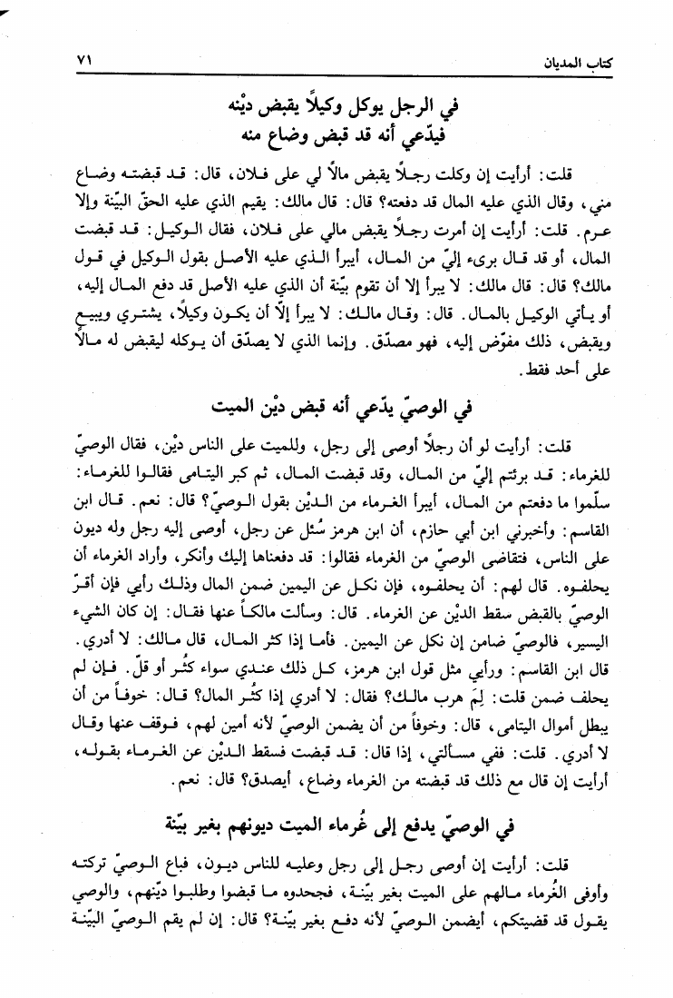 نام کتاب : المدونة الكبرى للإمام مالك رواية سحنون - ويليها مقدمات ابن رشد - ومعه: كتاب تزيين الممالك بمناقب سيدنا الإمام مالك للسيوطي، وكتاب مناقب سيدنا الإمام مالك للزواوي نویسنده : مالك بن أنس جلد : 4 صفحه : 71