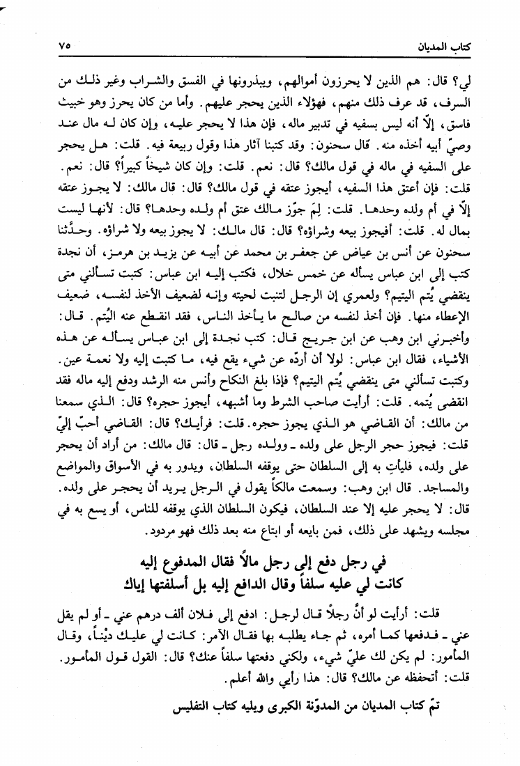 نام کتاب : المدونة الكبرى للإمام مالك رواية سحنون - ويليها مقدمات ابن رشد - ومعه: كتاب تزيين الممالك بمناقب سيدنا الإمام مالك للسيوطي، وكتاب مناقب سيدنا الإمام مالك للزواوي نویسنده : مالك بن أنس جلد : 4 صفحه : 75