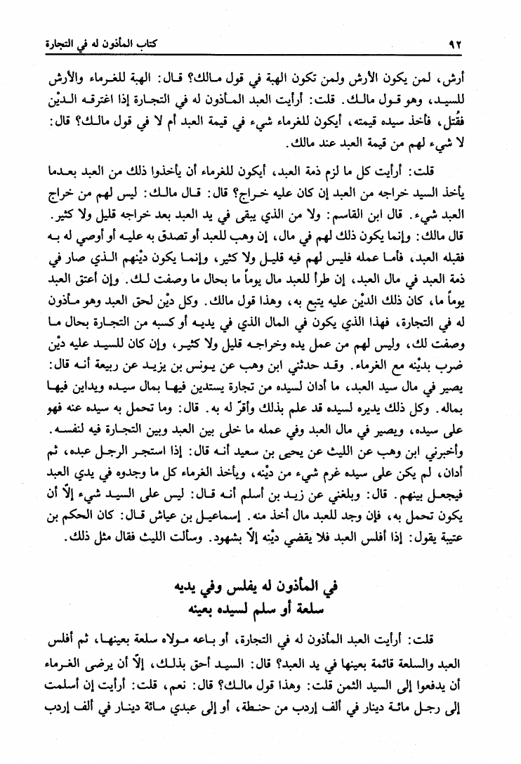 نام کتاب : المدونة الكبرى للإمام مالك رواية سحنون - ويليها مقدمات ابن رشد - ومعه: كتاب تزيين الممالك بمناقب سيدنا الإمام مالك للسيوطي، وكتاب مناقب سيدنا الإمام مالك للزواوي نویسنده : مالك بن أنس جلد : 4 صفحه : 92