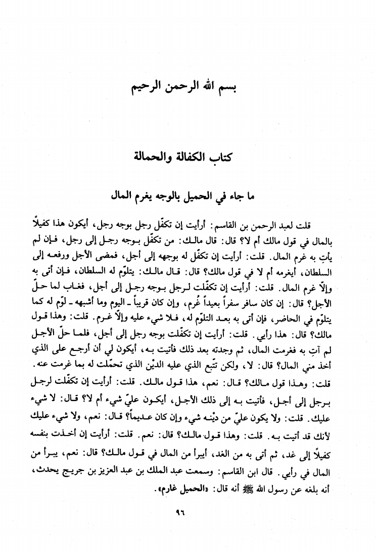 نام کتاب : المدونة الكبرى للإمام مالك رواية سحنون - ويليها مقدمات ابن رشد - ومعه: كتاب تزيين الممالك بمناقب سيدنا الإمام مالك للسيوطي، وكتاب مناقب سيدنا الإمام مالك للزواوي نویسنده : مالك بن أنس جلد : 4 صفحه : 96