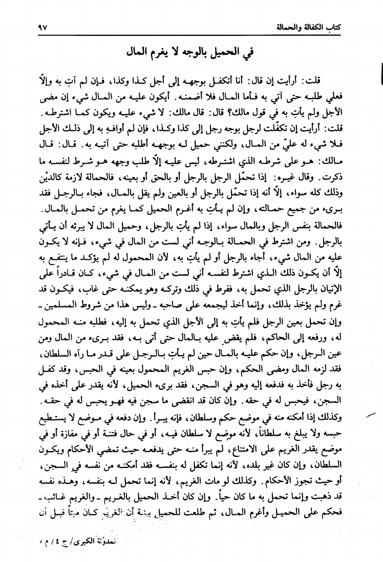 نام کتاب : المدونة الكبرى للإمام مالك رواية سحنون - ويليها مقدمات ابن رشد - ومعه: كتاب تزيين الممالك بمناقب سيدنا الإمام مالك للسيوطي، وكتاب مناقب سيدنا الإمام مالك للزواوي نویسنده : مالك بن أنس جلد : 4 صفحه : 97