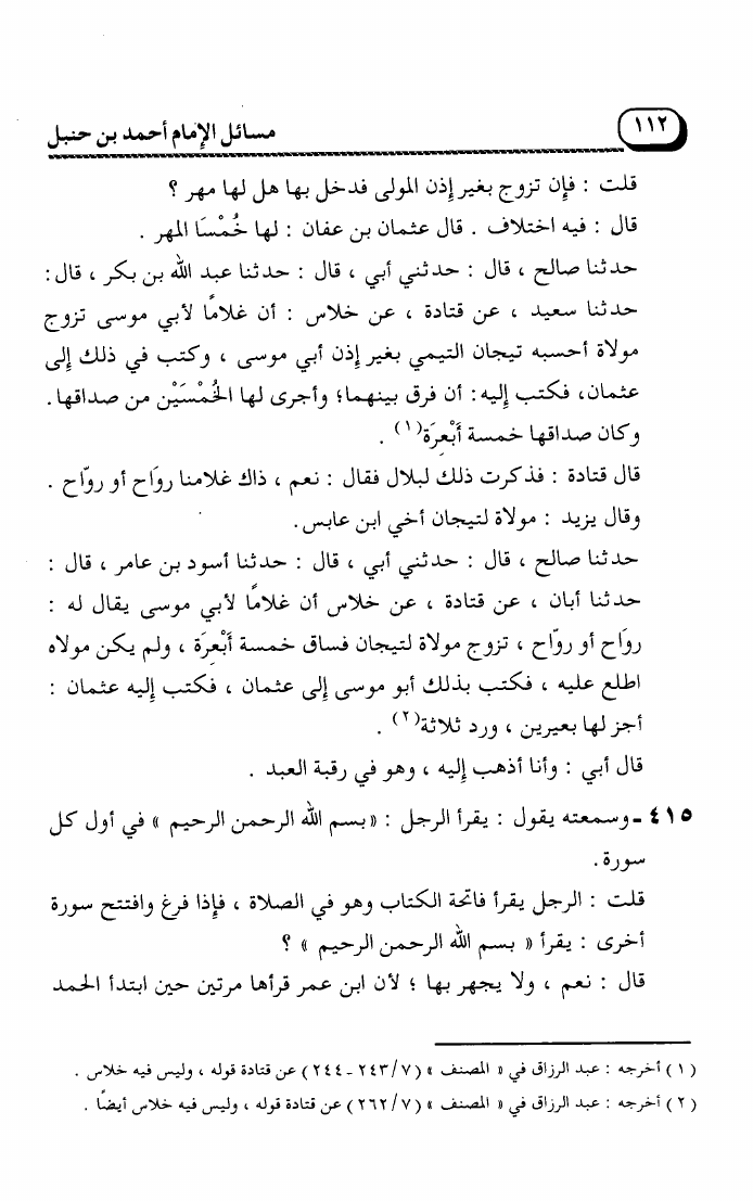 مسائل الإمام أحمد بن حنبل رواية ابنه أبي الفضل صالح (ت. عوض الله)