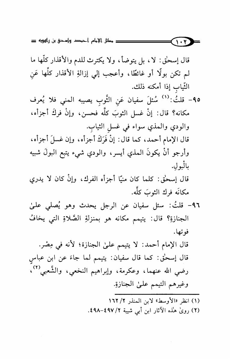 نام کتاب : مسائل الإمام أحمد بن حنبل وإسحاق ابن راهويه رواية إسحاق بن منصور الكوسج المروزي (ط. دار الهجرة) نویسنده : سحاق بن منصور الكوسج المروزي جلد : 1 صفحه : 102