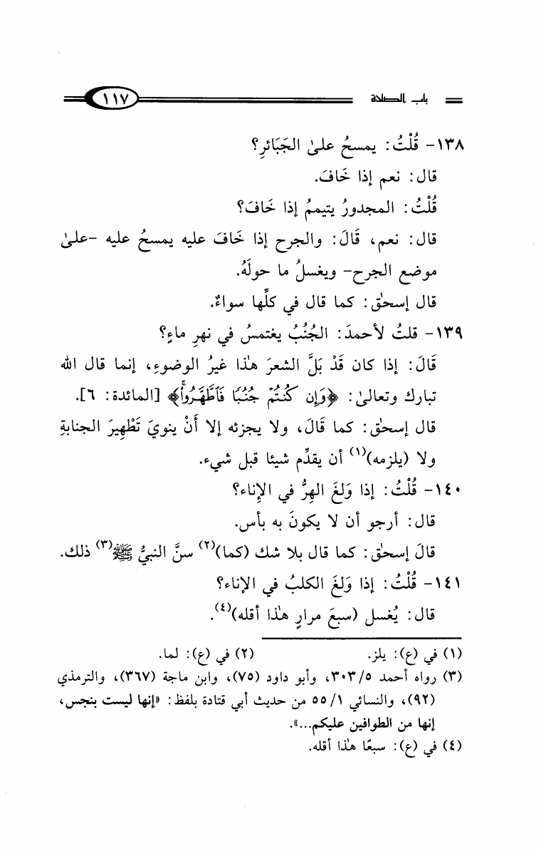نام کتاب : مسائل الإمام أحمد بن حنبل وإسحاق ابن راهويه رواية إسحاق بن منصور الكوسج المروزي (ط. دار الهجرة) نویسنده : سحاق بن منصور الكوسج المروزي جلد : 1 صفحه : 117