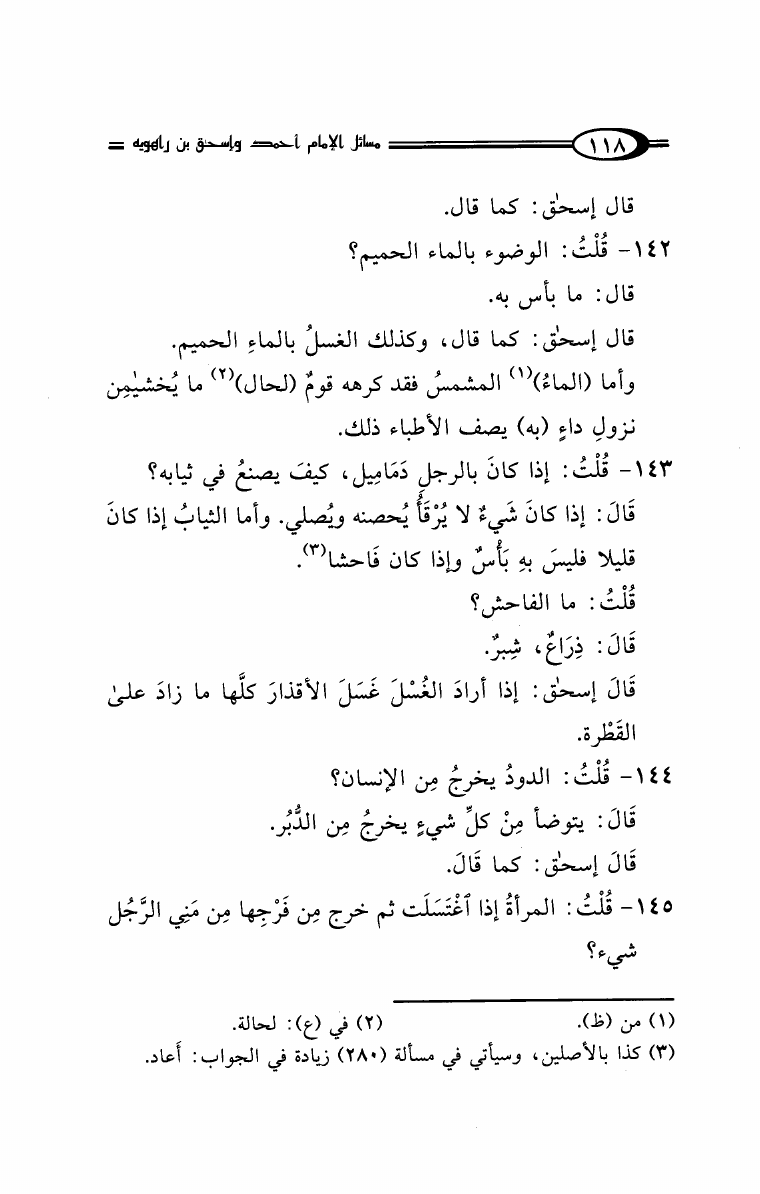 نام کتاب : مسائل الإمام أحمد بن حنبل وإسحاق ابن راهويه رواية إسحاق بن منصور الكوسج المروزي (ط. دار الهجرة) نویسنده : سحاق بن منصور الكوسج المروزي جلد : 1 صفحه : 118