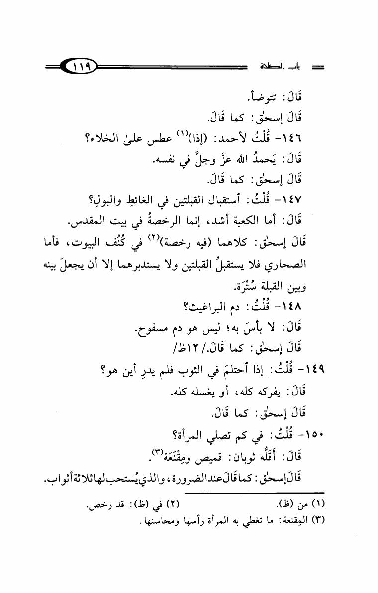 نام کتاب : مسائل الإمام أحمد بن حنبل وإسحاق ابن راهويه رواية إسحاق بن منصور الكوسج المروزي (ط. دار الهجرة) نویسنده : سحاق بن منصور الكوسج المروزي جلد : 1 صفحه : 119