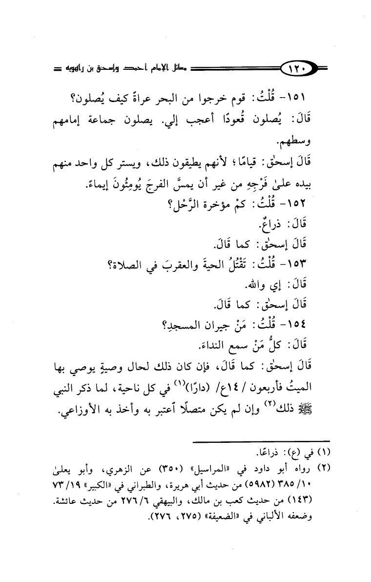 نام کتاب : مسائل الإمام أحمد بن حنبل وإسحاق ابن راهويه رواية إسحاق بن منصور الكوسج المروزي (ط. دار الهجرة) نویسنده : سحاق بن منصور الكوسج المروزي جلد : 1 صفحه : 120