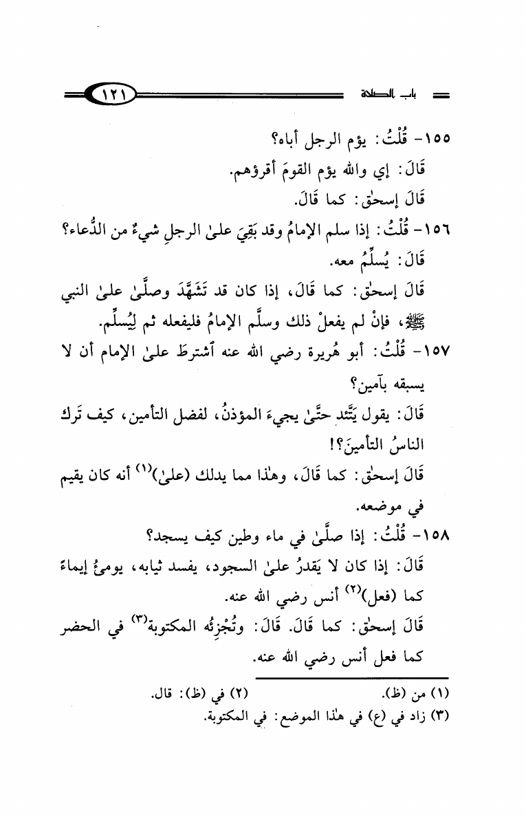 نام کتاب : مسائل الإمام أحمد بن حنبل وإسحاق ابن راهويه رواية إسحاق بن منصور الكوسج المروزي (ط. دار الهجرة) نویسنده : سحاق بن منصور الكوسج المروزي جلد : 1 صفحه : 121