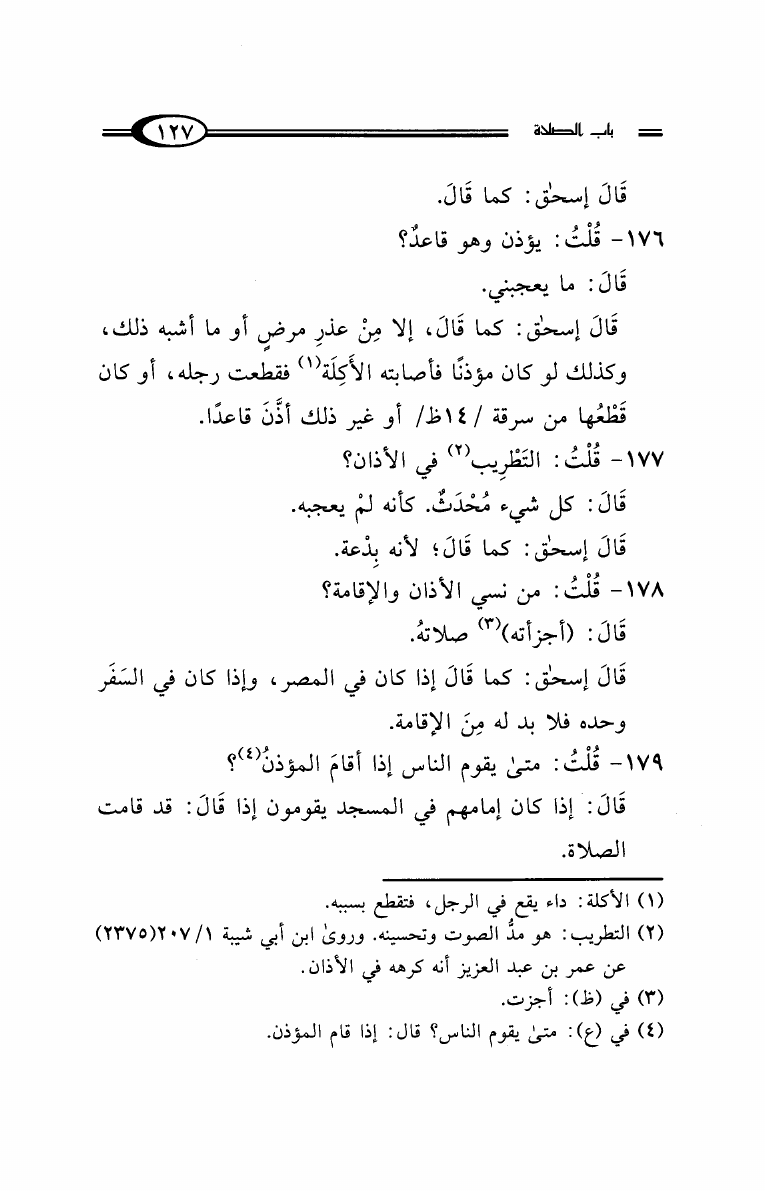 نام کتاب : مسائل الإمام أحمد بن حنبل وإسحاق ابن راهويه رواية إسحاق بن منصور الكوسج المروزي (ط. دار الهجرة) نویسنده : سحاق بن منصور الكوسج المروزي جلد : 1 صفحه : 127