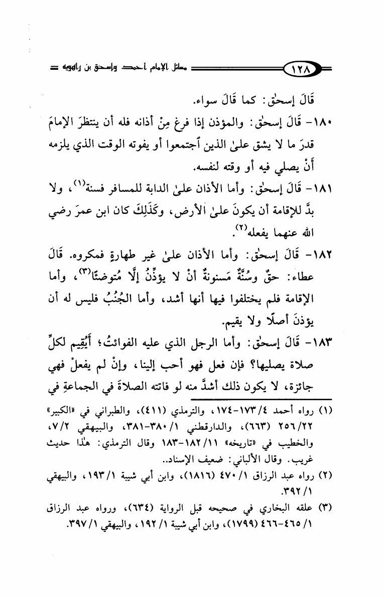 نام کتاب : مسائل الإمام أحمد بن حنبل وإسحاق ابن راهويه رواية إسحاق بن منصور الكوسج المروزي (ط. دار الهجرة) نویسنده : سحاق بن منصور الكوسج المروزي جلد : 1 صفحه : 128