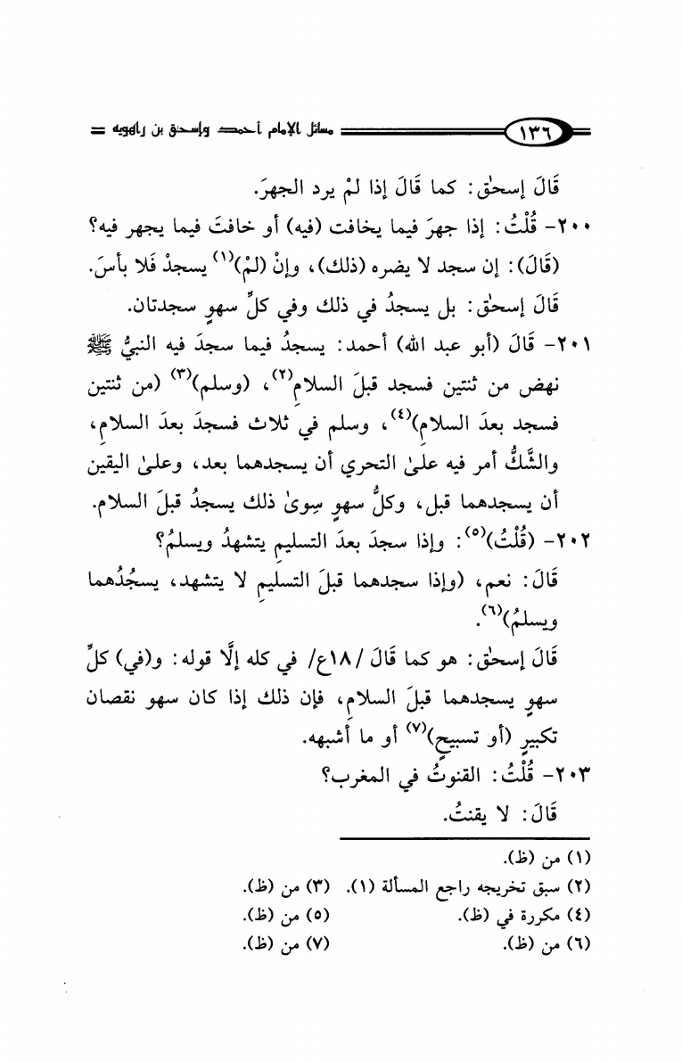 نام کتاب : مسائل الإمام أحمد بن حنبل وإسحاق ابن راهويه رواية إسحاق بن منصور الكوسج المروزي (ط. دار الهجرة) نویسنده : سحاق بن منصور الكوسج المروزي جلد : 1 صفحه : 136