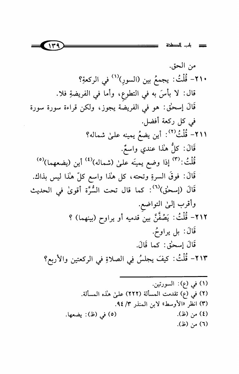 نام کتاب : مسائل الإمام أحمد بن حنبل وإسحاق ابن راهويه رواية إسحاق بن منصور الكوسج المروزي (ط. دار الهجرة) نویسنده : سحاق بن منصور الكوسج المروزي جلد : 1 صفحه : 139