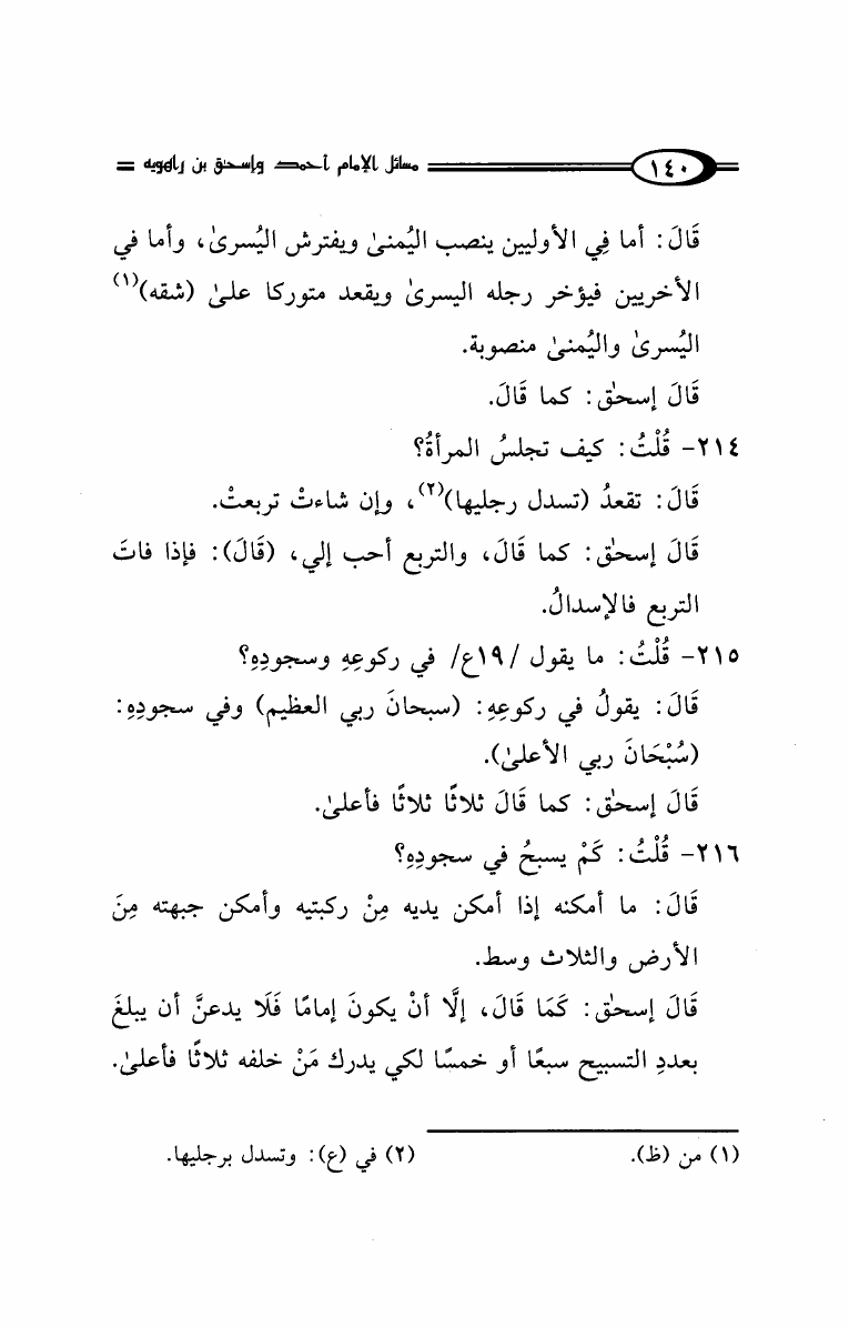نام کتاب : مسائل الإمام أحمد بن حنبل وإسحاق ابن راهويه رواية إسحاق بن منصور الكوسج المروزي (ط. دار الهجرة) نویسنده : سحاق بن منصور الكوسج المروزي جلد : 1 صفحه : 140