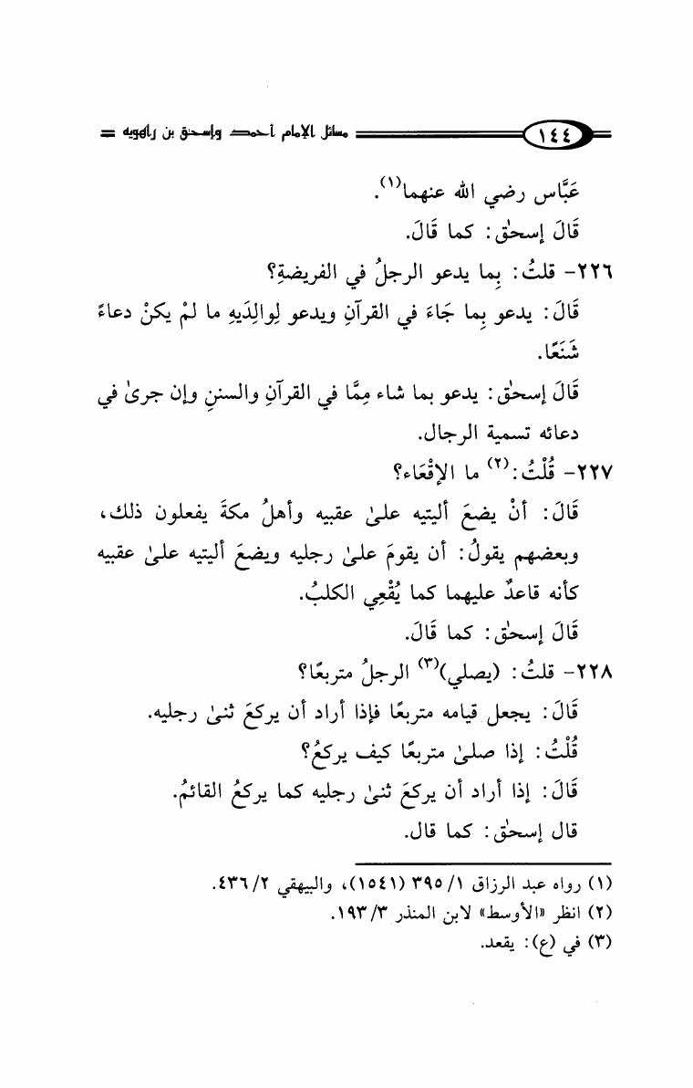 نام کتاب : مسائل الإمام أحمد بن حنبل وإسحاق ابن راهويه رواية إسحاق بن منصور الكوسج المروزي (ط. دار الهجرة) نویسنده : سحاق بن منصور الكوسج المروزي جلد : 1 صفحه : 144