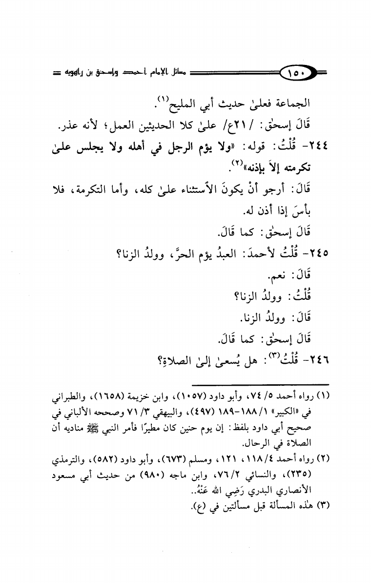 نام کتاب : مسائل الإمام أحمد بن حنبل وإسحاق ابن راهويه رواية إسحاق بن منصور الكوسج المروزي (ط. دار الهجرة) نویسنده : سحاق بن منصور الكوسج المروزي جلد : 1 صفحه : 150