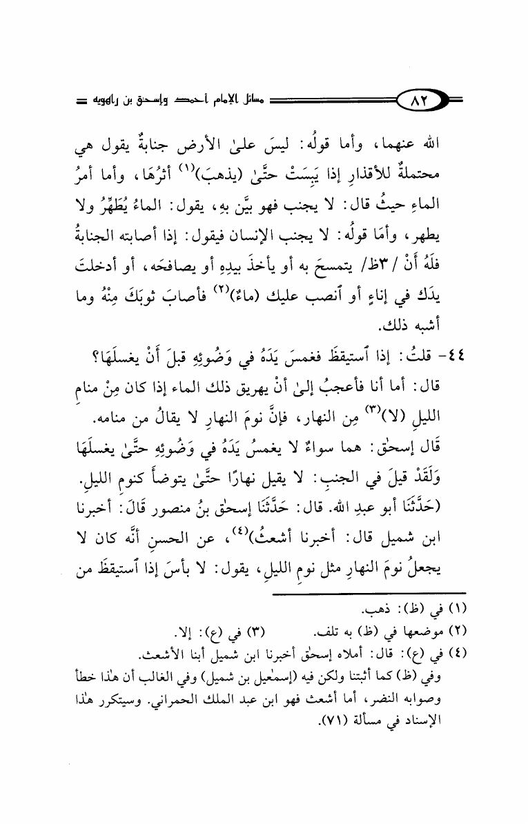 نام کتاب : مسائل الإمام أحمد بن حنبل وإسحاق ابن راهويه رواية إسحاق بن منصور الكوسج المروزي (ط. دار الهجرة) نویسنده : سحاق بن منصور الكوسج المروزي جلد : 1 صفحه : 82